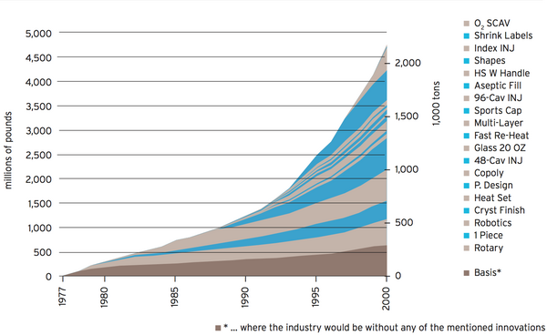 So, is innovation the answer? To fully appreciate the results of goal-focused innovation and development, a broad selection of seasoned industry professionals – including resin producers, equipment manufacturers, converters, bottlers, brand owners, closure manufacturers, and label producers – were surveyed back in 2000 to determine which innovation was responsible for the PET packaging industry’s growth from inception until the growth curve started showing the flattening typical of a maturing industry (Fig. 2).