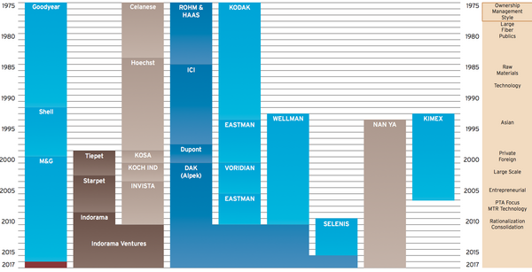 What good is a PET resin plant without self-manufactured PTA? Given the speed at which the global polyester industry is learning, not much good at all. This answer may seem obvious now, but it was not so obvious to most for decades! Why did it take so long to recognize this fact? For a long time, other strategies were deemed more important and significant for improving margins. Take a look at the right side of the above chart (Fig. 1). The trend is toward large scale, melt- to-resin, acquisitions, expanding outside of NAFTA, private entrepreneurship, and ultimately complete raw material control if not outright ownership. Not just of PTA or MEG, but of both – and of ethylene and PX as well.