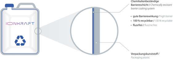 The deep-tech startup IonKraft, which has its roots at IKV, will present its prototype machine technology for the coating of large-volume blow mouldings for the first time to the public on IKV's stand at K 2022. The barrier coat has been shown to prevent the migration of substances out of the contents as well as out of the packaging into the contents. Besides it can be applied to the outer surface of the packaging where it could serve as an odour barrier for the often unpleasant inherent odour of recyclate material. Both features open up new possibilities for the use of recyclates in packagings. During K 2022, IonKraft will apply a coating to containers in a demonstration on the prototype machine and show how it can be integrated into a production line for large-volume blow mouldings.