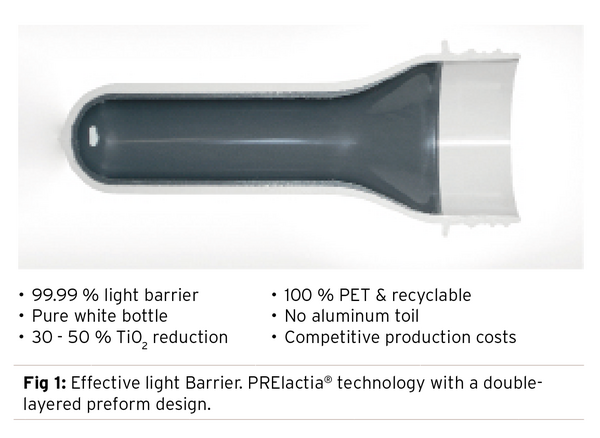 Once a decision in favor of PET has been made, the question of the layers must be settled. There are some single-layer preforms that, at first glance, appear to be unbeatable lightweights. Recently, it was announced that the weight had been reduced to 20 grams per liter of milk. However, that low weight is achieved with a 32-millimeter thread, which is not very popular on the market (38 millimeters are standard) and without information on whether the bottle can be filled with ultra-high temperature treated (UHT) milk – the queen of expiration dates. It convinces with a shelf life time of up to six months and thereby surpasses fresh and so-called “extended shelf life” milk (approximately 21 days) by far. Single-component preforms offer a supposed advantage: They can be manufactured with existing production lines and therefore without investing in a new mold or a new machine. However, there is also a downside that quickly negates the anticipated savings: Single-layer preforms require a large amount (at least 15%) of additives (generally titanium oxide) in order to achieve the same protective effect against incoming light as preforms that have multiple components, of which one is specifically designed to assume a barrier function. These additives are expensive. Assuming a production amount of 70 million preforms and a preform weight of 20 grams, the consumption of additives amounts to 210 tons. At a price of Euro 7.50 per kilogram that adds up to Euro 1.5 million per year!
