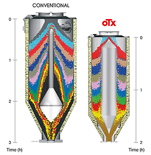 Extensive studies began about 30 years ago, and through software for "discrete element" analysis, introduced in 2007, a series of experiments were carried out to evaluate granule by granule the path through the traditional hopper. The analysis showed that with these hoppers, it was not possible to guarantee the release of properly dehumidified material, as it could not be ensured that all granules met the required residence times.