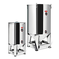 Cylindrical stainless steel storage silos, complete with a removable lid and one-way suction valves, with capacities ranging from 1.800 to 30.000 dmc.