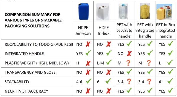 The main drawback of PET has been the inability to have an integrated handle, like for HDPE jerry cans. This had been resolved by inserting a separately moulded handle in the neck of the PET bottle, which involves making or buying the handle and assembling it onto the neck of the bottle. This extra cost for the handle reduces the overall cost saving that arises from the lower weight of PET stackable bottles.