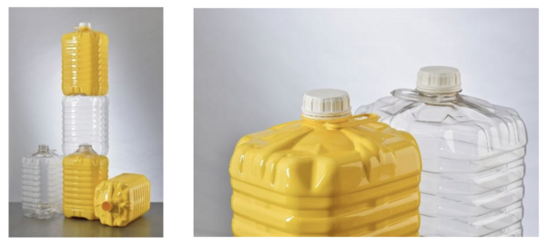 There is a trend for HDPE jerry cans to be replaced by PET stackable bottles due to the substantially lower weight. With careful design, the weight of a PET stackable bottle could 40% less than the equivalent size HDPE jerry can. Additionally, PET exhibits high mechanical strength, transparency, a smooth and glossy surface finish and can be 100% recycled back to food-grade PET. Importantly, the neck of a PET container is injection moulded, with very accurate dimensions, enabling leak-proof closure without the need of costly wads.