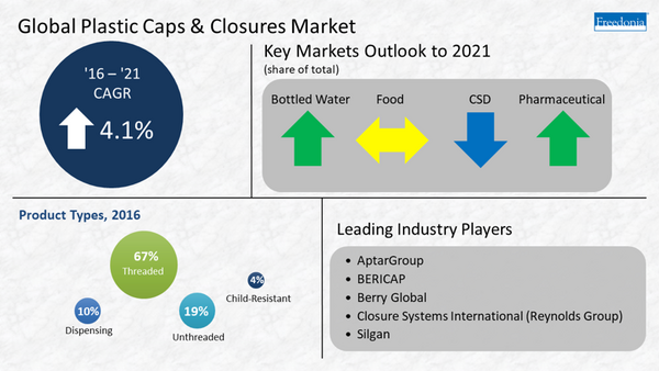 Global plastic caps and closures demand is projected to advance 4.1% per year to nearly 1.9 trillion units in 2021. Gains will be driven by bottled water, which has become the largest application for plastic closures and offers the greatest growth opportunities through 2021. These and other trends are presented in Global Plastic Caps & Closures Market, a new study from The Freedonia Group, a Cleveland-based industry research firm.