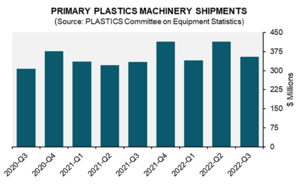 “It can be argued that the slowdown in plastics machinery shipment in the third quarter is in sync with the cooling of the U.S. economy. However, compared to the quarterly shipments in 2021—a stellar year for the plastics industry particularly for plastics equipment suppliers—this year’s third quarter shipments remain above the first three quarters’ shipments last year,” stated Dr. Perc Pineda, PLASTICS Chief Economic Officer. “Historically, there is a bump up in shipments in the fourth quarter. This was the case even before the COVID-19 pandemic. Given supply chain issues due to the pandemic, which have stretched delivery lead time, it would not be surprising to see shipments in the fourth quarter to be above the third quarter. There is also a huge year-end push for businesses to get their manufacturing capacity in gear for the coming year. This should support stable demand for plastics equipment next year, albeit lower than this year because of moderating economic growth”concluded Pineda..