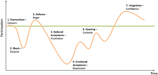During the shock phase participation sinks as people usually don’t under- stand why certain changes must be implemented. Especially if communication has been poorly conducted and no supporting material has reached the individuals yet, participation can be drastically reduced.