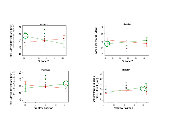 The blow molding interaction plots (figure 4) show the similarity of effects for stress crack resistance and the stress measurements. The combinations of process factors that result in the min stress and the max distance between the gate and biaxial stress point are the same as those that result in the max stress crack resistance as indicated with the green circles. Note how differently the preforms (green line = optimized injection process, red line = original injection process) behaved for different injection molding configurations suggesting the importance of injection process control to an effective strategy to optimize stress crack resistance.