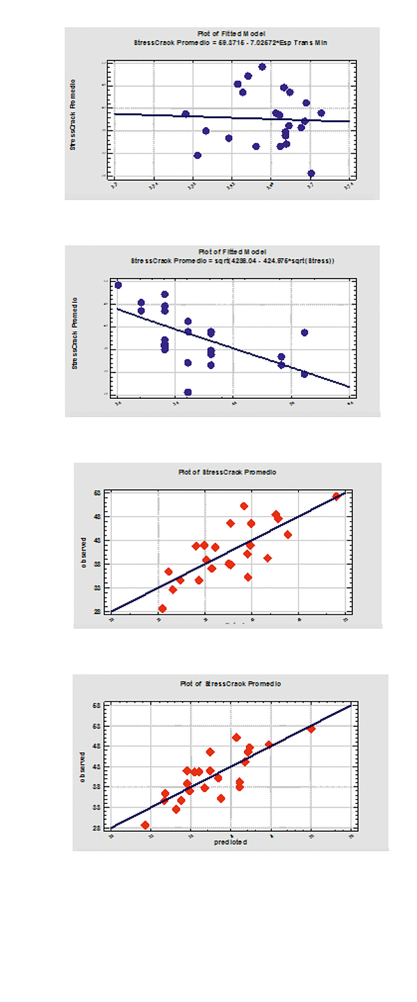 Correlations between stress and stress crack resistance test results were statistically significant at the 99% confidence level. The regression plots (figure 3) compare correlations with stress crack resistance for four cases: (1) base thickness; (2) max stress; (3) max stress plus distance measured from gate to the biaxial stress point; (4) max stress plus distance measured from gate to the biaxial stress point plus base thickness. Correlation with base thickness wasn’t statistically significant. Correlations for each of the other three cases were statistically significant at the 99% confidence level. The R2 values, which indicate the percent of variation in the stress crack test results explained by the independent variable(s): (1) = 5%; (2) = 45%; (3) = 55%; (4) = 59%. It is likely that much of the additional variation is due to manufacturing process variation. We would expect higher R2 values if we had been able to test the same containers for stress as that we tested from stress crack resistance.