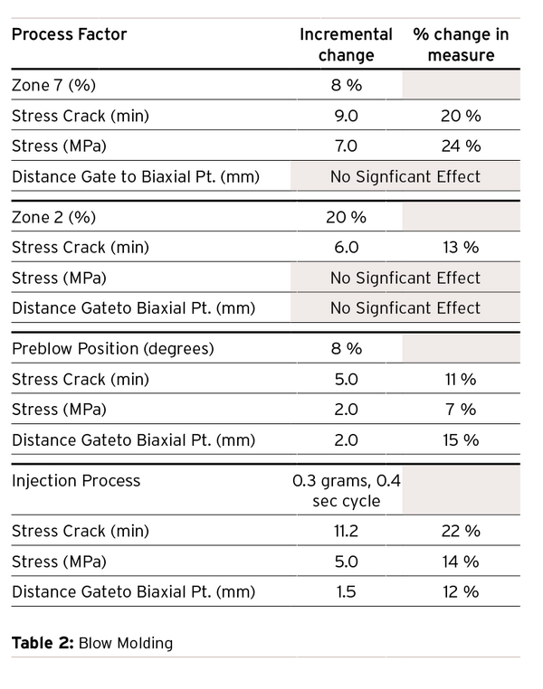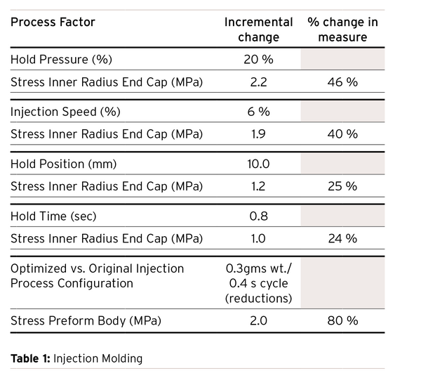 For the process variable ranges studied in the DOEs, the largest effect on stress crack resistance was the injection process configuration from which the preforms were molded. A change from the injection process that enabled the best stress crack results back to the original process with 0.3 gm increased preform weight and a 0.4 sec increased cycle would result in an 11 min reduction in stress crack resistance before re-optimizing the blow molding process configuration, a 5 MPa (14%) increase in container base stress and a 1.5 mm (12%) decrease in distance from the gate to the biaxial stress point. The same changes in the injection process produced an incremental change in preform residual stress of 2 MPa change (46%) in preform stress. The table shows the sensitivity of preform stress to the individual injection process variables.