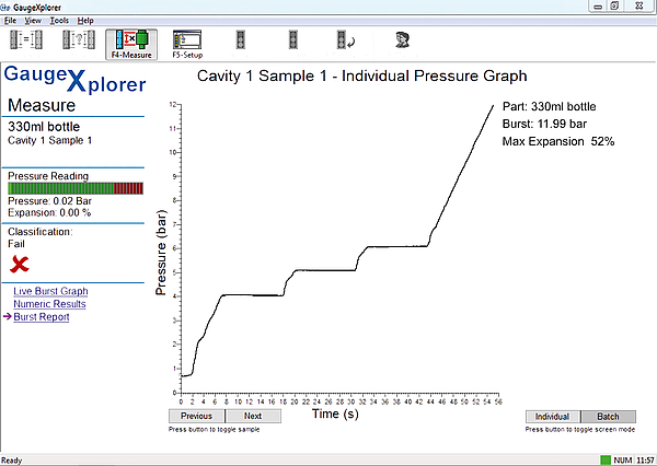 Torus’ B303 Burst Gauge, see Figure 7 offers this functionality in a robust and user-friendly design. Bottles are loaded individually into custom location discs. Once secured the burst routine can start behind a locked, waterproof safety door, providing a controlled test environment. A user-definable test procedure is performed and live graphs are updated on screen. Additional numerical and graphical results are displayed when the test is complete.