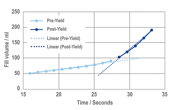 An indicative yield point can be found by analysing the recorded volume data. This is done by locating the change in gradient of the volume expansion curve and performing a least squares linear regression on both regions of the curve to find the intersection point. This process is shown graphically in Figure 5.
