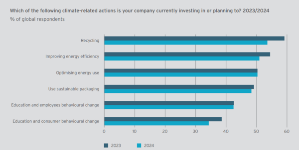 Better recycling is essential to increase recyclate capacity. Businesses increasingly recognise this, which is why recycling was the leading climaterelated action for investment in surveys conducted by Euromonitor in 2023 and 2024. Private label challenges brands in the race to drive down virgin plastics use, with Aldi in the UK transitioning all its soft drinks PET bottles to 100% rPET, which it expects will save 10,000 tonnes of virgin plastic annually. Higher demand for recyclate is continuing to be seen across food, drinks, beauty and home care.