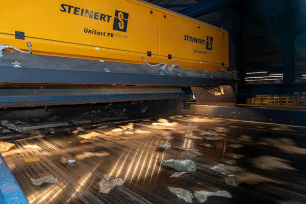Cirrec deploys three STEINERT UniSort PR EVO 5.0 systems that analyse each tray individually. The machines use sensor fusion: a hyperspectral NIR camera captures the chemical composition whilst a colour camera identifies visual characteristics. The key feature is that both sensors view the same point on the material at the same time. This improves data quality for AI training and, in turn, sorting accuracy.