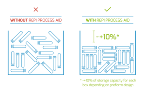 REPI Process Aid Additives reduce sticking and create a better slip effect between one another of preforms preventing surface scratches and at the same time optimising their storage up to +10% with consequent advantages in terms of storage and transport costs.