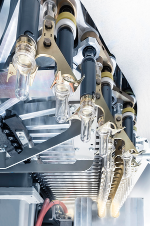 The Series V saves up to 40% in energy compared to its predecessor through the implementation of a completely new heating concept. The near infrared heater centrally installed in the closed reflector tunnel forms the nucleus of this. In the heater the preforms pass the centrally arranged heating units to both the left and right. This means that the preforms have a very small pitch of 18 millimeters instead of the previous approximately 37 millimeters. KHS has thus been able to reduce the number of heater boxes by up to 40% which not only results in such vast energy savings but also cuts down on the amount of radiation loss.