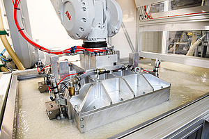 The raw paper pulp is processed in batches up to 1% fiber content. Flow simulations ensure that the fibers are evenly distributed over the basin volume. The metal mesh suction tool dips into the slurry, the vacuum sucks up liquid and leaves the fibers in the form of a filter cake in the tool. A spray bar cleans the edge of the tool and removes excess pulp. The suction tool then moves into a flexible counter tool of the pre-pressing station. Alexander Huber, Fiber Product Manager, illustrates: "The flexible pre-pressing tool ensures very even fiber distribution across the entire tool geometry."