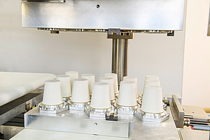 A full scale pilot system is already running, producing Kiefel reference cups with a cycle time of 15 seconds. Huber emphasizes: “We now have numerous systems in our order backlog. We will deliver the first to a customer in the middle of this year.” This makes Kiefel the first plastic thermoforming machine manufacturer to offer highly automated systems for fiber thermoforming.