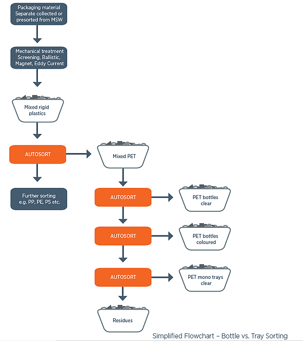 The step-by-step process which concludes with the separation of single-layer PET trays and PET bottles is seamless and flexible. During the preparation for sorting mixed plastics into different polymers, packaging material collected or pre-sorted from municipal solid waste (MSW) first runs through a mechanical treatment process which reduces voluminous materials, mainly soft items such as plastic, film, and non-plastic products. To then separate mixed PET into different polymers, AUTOSORT functions as a combined system, detecting material and colour in combination with grain size. Even with a very mixed material input, this process achieves an impressive sorting efficiency of 95% or greater.