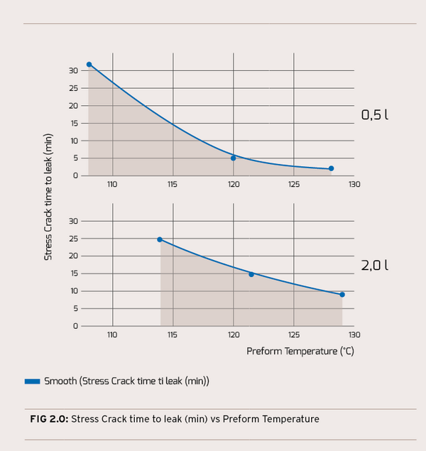 The results showed container performance improved across the board with the most dramatic improvement found in environmental stress crack resistance. The results in Figure 2.0 show a 0.5 liter container time to stress crack improving from under five minutes above a processing temperature of 128 °C to over 30 minutes with a processing temperature just below 110 °C. With clear improvement in container performance as temperature decreased, the next step was to identify the correct processing temperature for the best possible container.