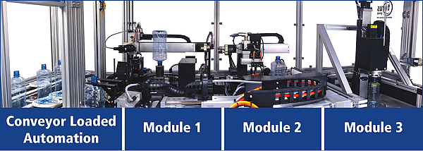 The TQ-Lab process The operator loads batches of containers onto a flexible puck system which cycles on a turnaround conveyor, the relevant program is then selected from a single centralised interface. The operator is then able to walk away and allow the TQ-Lab to take care of the rest. Programming time has been reduced to a minimum by use of a custom, neck-find vision system at the pick-up area of the conveyor, see Fig. 2.
