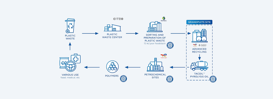 The new plant uses innovative recycling technology supplied by our partner Plastic Energy. It transforms hard-to-recycle plastic waste from French households, which is currently sent to landfill or incineration, into a synthetic oil through a pyrolysis process, involving heating the waste to high temperatures in an oxygen-free environment and under pressure. This advanced recycling process makes it possible to recycle waste that cannot be recycled mechanically.