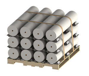 The Roll Stop can withstand up to 2400 pounds and holds up to four 10–12-inch diameter rolls per layer. The reversible design allows for roll protection above and below the roll and is safer than pyramid stacking. Because rolled goods can be stacked on pallets to the height of the truck trailer or shipping container, the Roll Stop reduces outbound freight costs. In addition, stacking with Roll Stop takes up less floor space than other packing materials including foam. When not in use, the nesting design allows for minimal storage space utilization. Appropriate for use with plastic film, metallic film, textiles, and more, the Roll Stop is available in quantities of 100 and up.