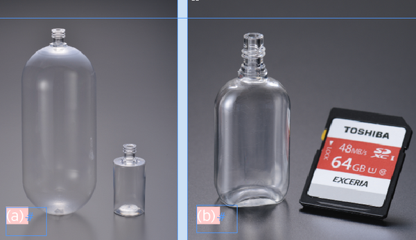 In order to maintain optimum stretch ratios, any preform design can normally only be blown into a relatively limited range of container dimensions. But in figure 15(a), the two containers shown (450ml and 40ml) were actually molded from the same preform design. To maintain correct stretch-blow ratios, the preform for the left-hand bottle was significantly re-formed at the conditioning station prior to blowing.