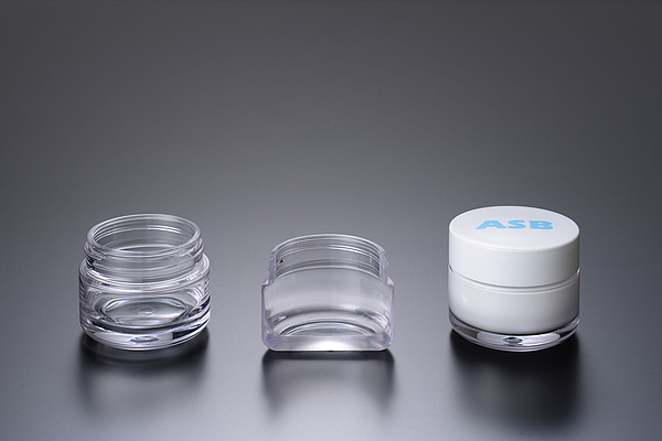 This lotion jar in figure 10 was molded by ASB using a recently patented process and has a thick wall with a base that is 10mm thick and yet it can be molded without resorting to special materials. This is achieved by utilizing advanced cooling channel design together with injection mold parts that move as the cavity fills. The cavity is initially filled with a relatively thin preform then, as injection continues, mold parts retract, allowing the preform thickness to be built up with continuous controlled cooling.