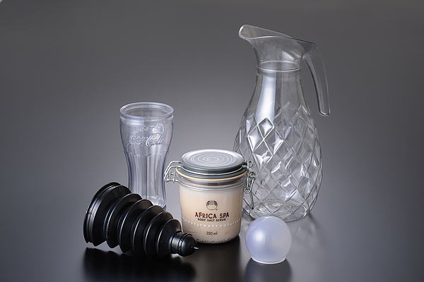 In figure 2 we can see some lesser known one-step molded examples such as a pitcher, a drinking cup, a steering gaiter for a car and a lamp cover molded in polycarbonate.