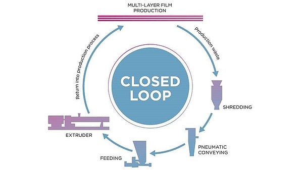 Following homogenization in the ZSK extruder, in the closed-loop concept, the recycled material is added back into the multi-layer film production process; with no quality loss and the proportion of added recyclate is very high. Multi-layer film manufacturing thus takes place sustainably, highly efficiently, and resource-friendly with the aid of advanced technologies.