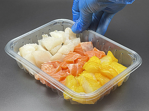 The container, called Piranha™, is sealed using a series of raised teeth that run around the sealing flange instead of applying a layer of polyethylene or adhesive, which are typically used to seal the lid of modified atmosphere packaging (MAP). The raised teeth maintain the seal's integrity even if the flange becomes contaminated by animal fat, which can interfere with closure on traditional packaging for meat, fish and poultry (MFP) products.