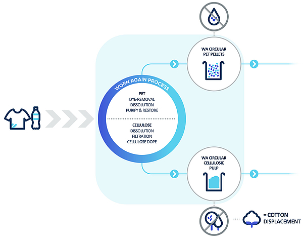 The pilot plant is designed to validate and develop Worn Again Technologies’ proprietary process which separates, decontaminates and extracts PET polymer and cellulose (from cotton) from non-reusable textiles and PET bottles and packaging to go back into supply chains as raw materials to become new products as part of a continual cycle.