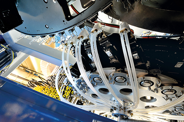 Operation is foolproof – mechanical cam synchronization of mold movements and preform ejection eliminates operator error for example. Flexible too: the mold carousel can hold molds for two different sizes of preforms at the same time if necessary. Inline total quality control is performed with cameras checking neck finish, body and gate, while an optical pyrometer measures preform temperatures.